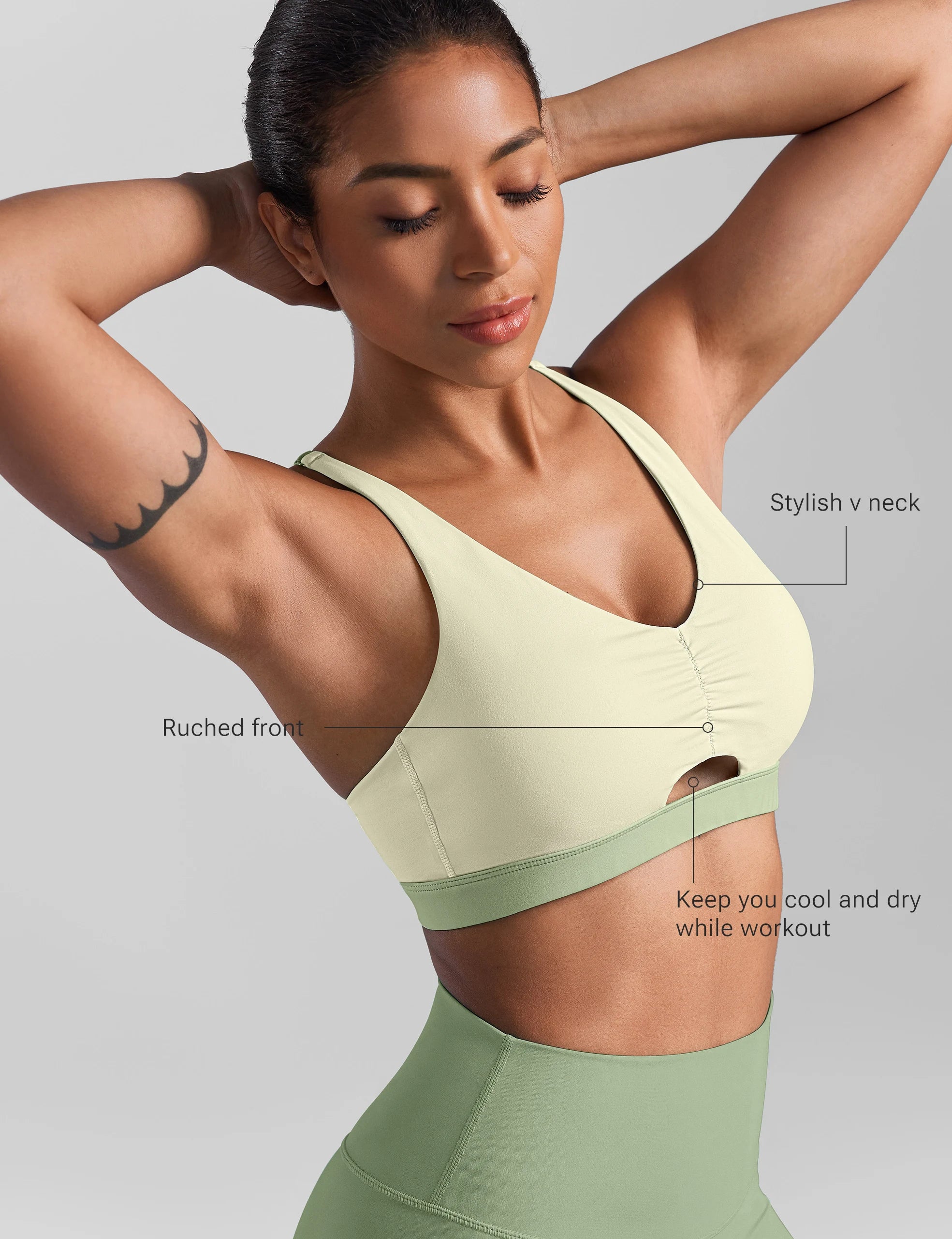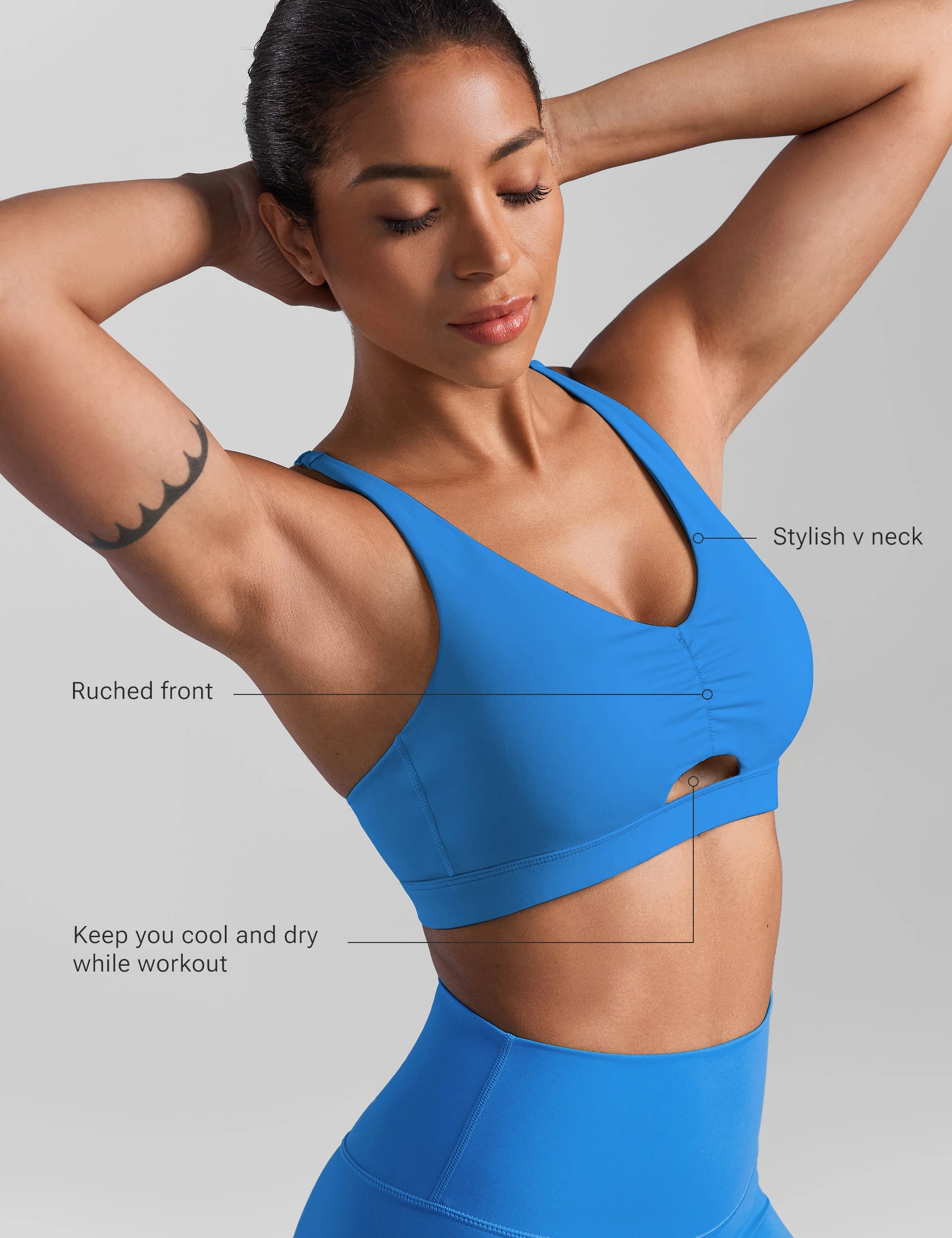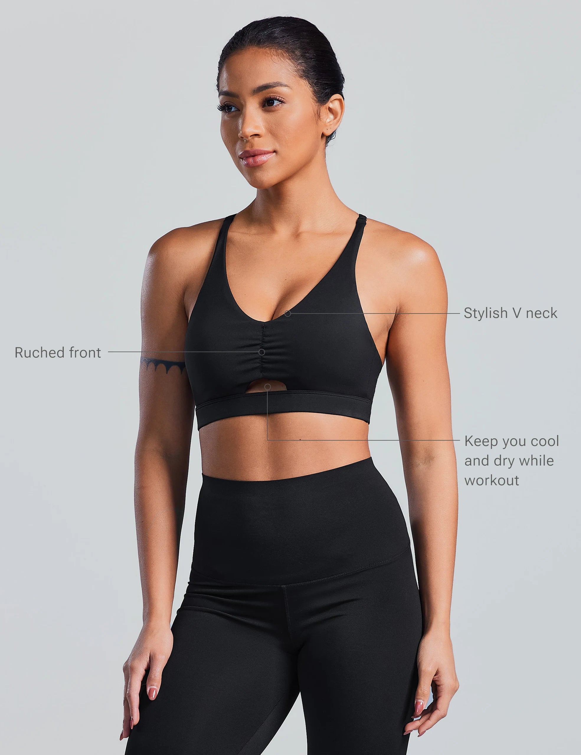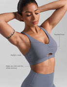 - Ruched front, keep you cool and dry while workout